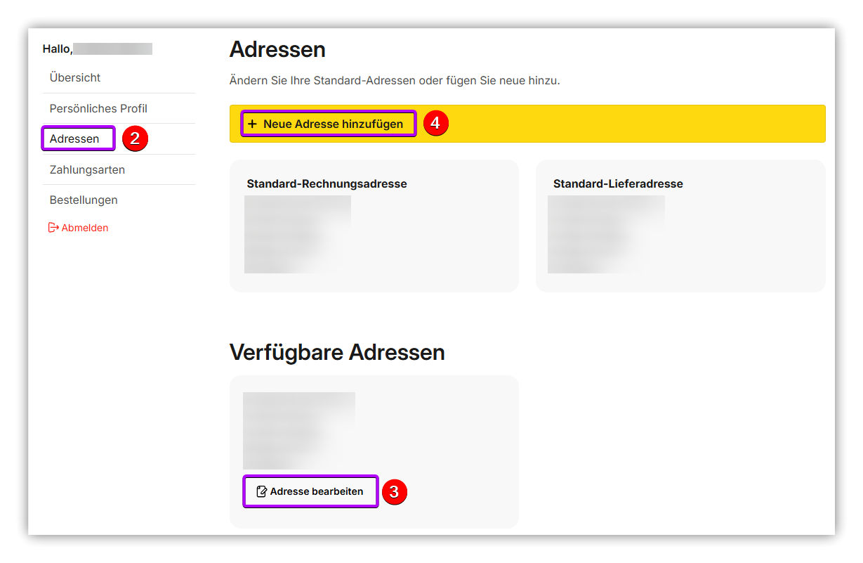 Nachdem Sie sich im Onlineshop eingeloggt haben, können Sie im Kundenbereich bestehende Adressen anpassen, sowie neue, zusätzliche Adressen erstellen.