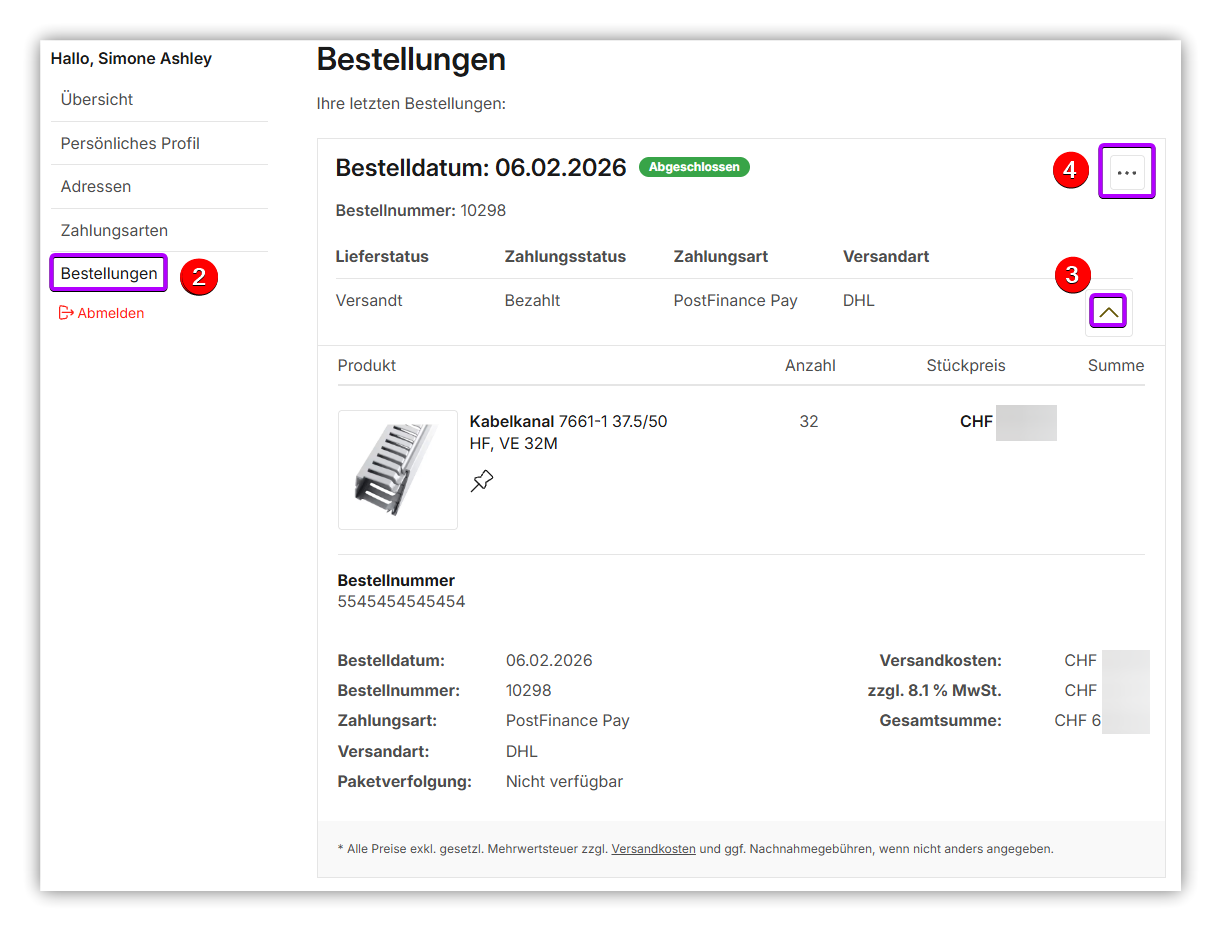 3. Hier sehen Sie bereits getätigte Bestellungen. Mit dem Pfeil können Sie die Ansicht für einzelne Bestellungen erweitern.