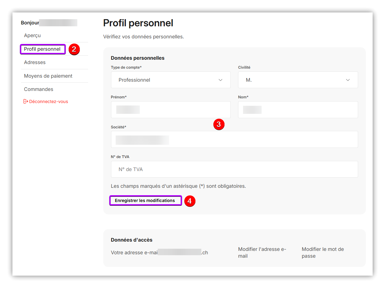 Dans votre compte client, vous pouvez modifier vous-même vos données personnelles.