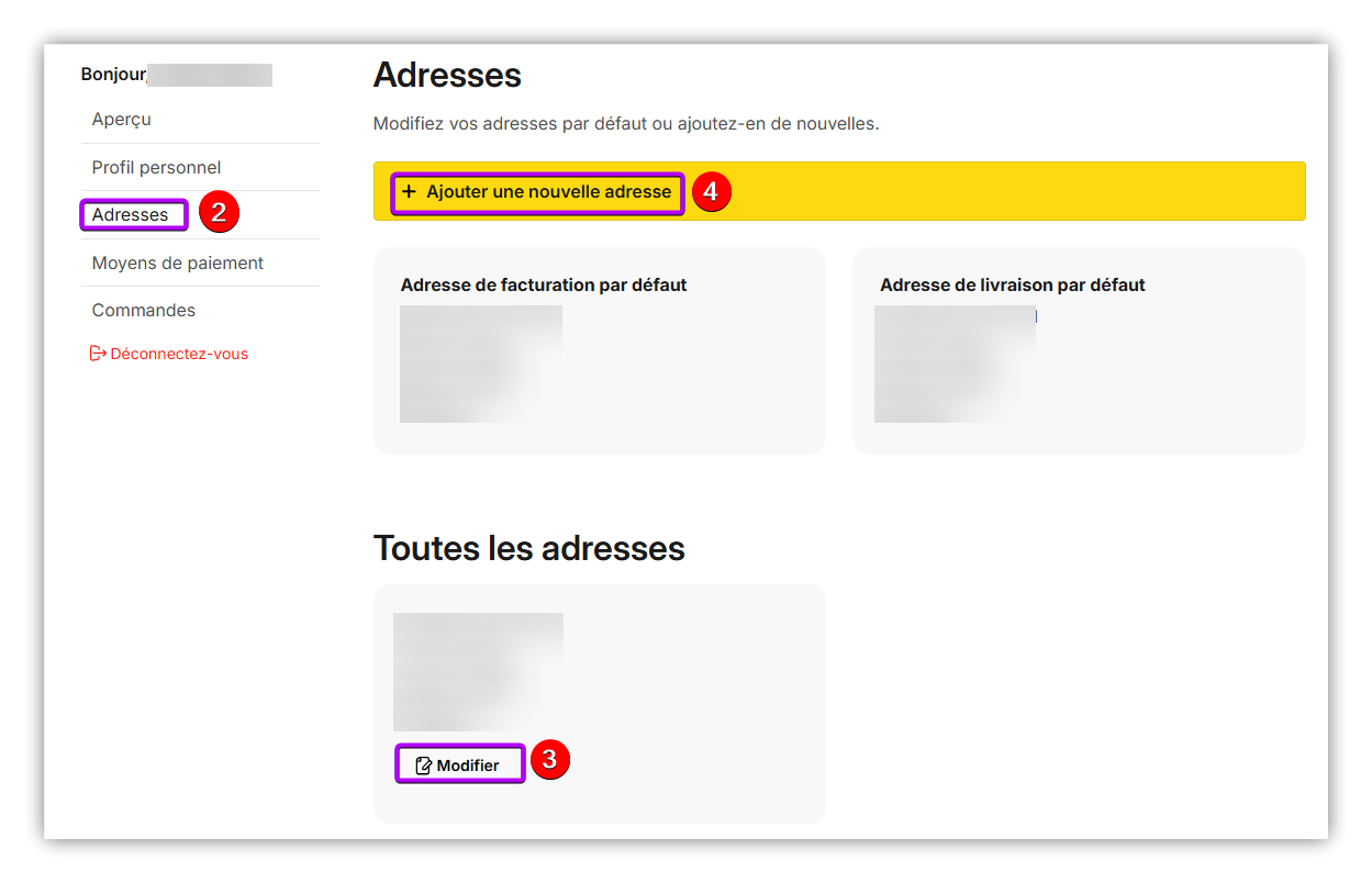 Après vous être connecté à la boutique en ligne, vous pouvez adapter les adresses existantes dans l'espace client, ainsi que créer de nouvelles adresses supplémentaires.